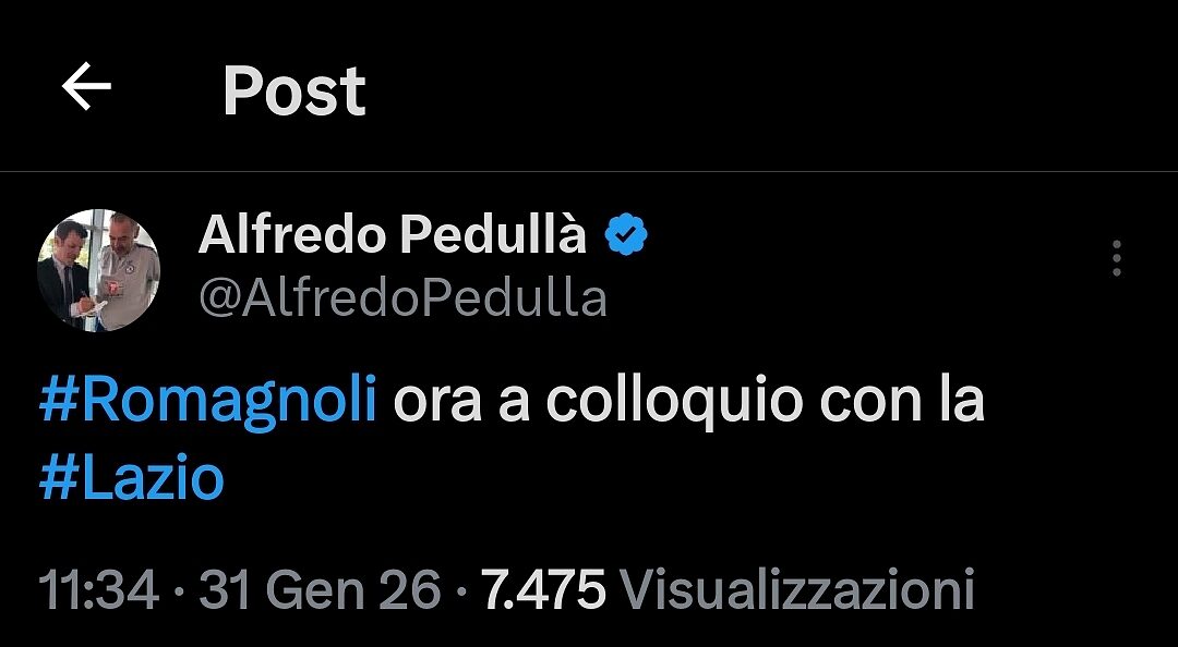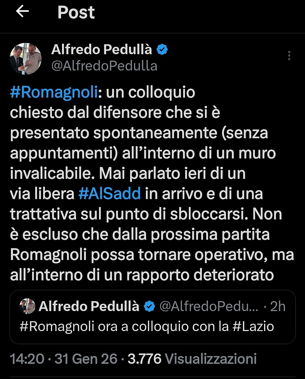 Dopo l'assenza di Romagnoli nel corso della gara a Genoa e la sua presenza sugli spalti per cercare di restare in qualche modo vicino alla squadra, sembra che il difensore centrale stia cercando di parlare nuovamente con la Società. Come riportato da Alfredo Pedullà sulla piattaforma social X, in questo momento, il numero 13 sta tenendo un colloquio con la Lazio, infatti, sembra che il difensore centrale si sia recato a Formello ed abbia richiesto un confronto.