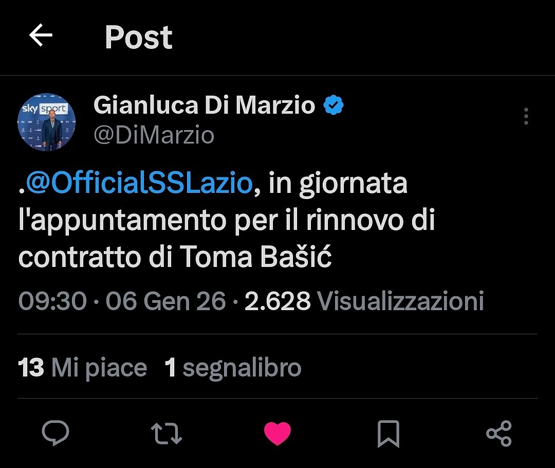 La finestra di mercato di gennaio sta per aprirsi e, oltre a lavorare sulla questione arrivi e partenze, la Società biancoceleste deve occuparsi anche della questione rinnovi, per tentare di non perdere calciatori ormai ritenuti pilastri. Proprio riguardo a ciò, Gianluca di Marzio ha rivelato sulla piattaforma X che in giornata ci sarà l'incontro con Toma Basic per discutere del suo rinnovo.