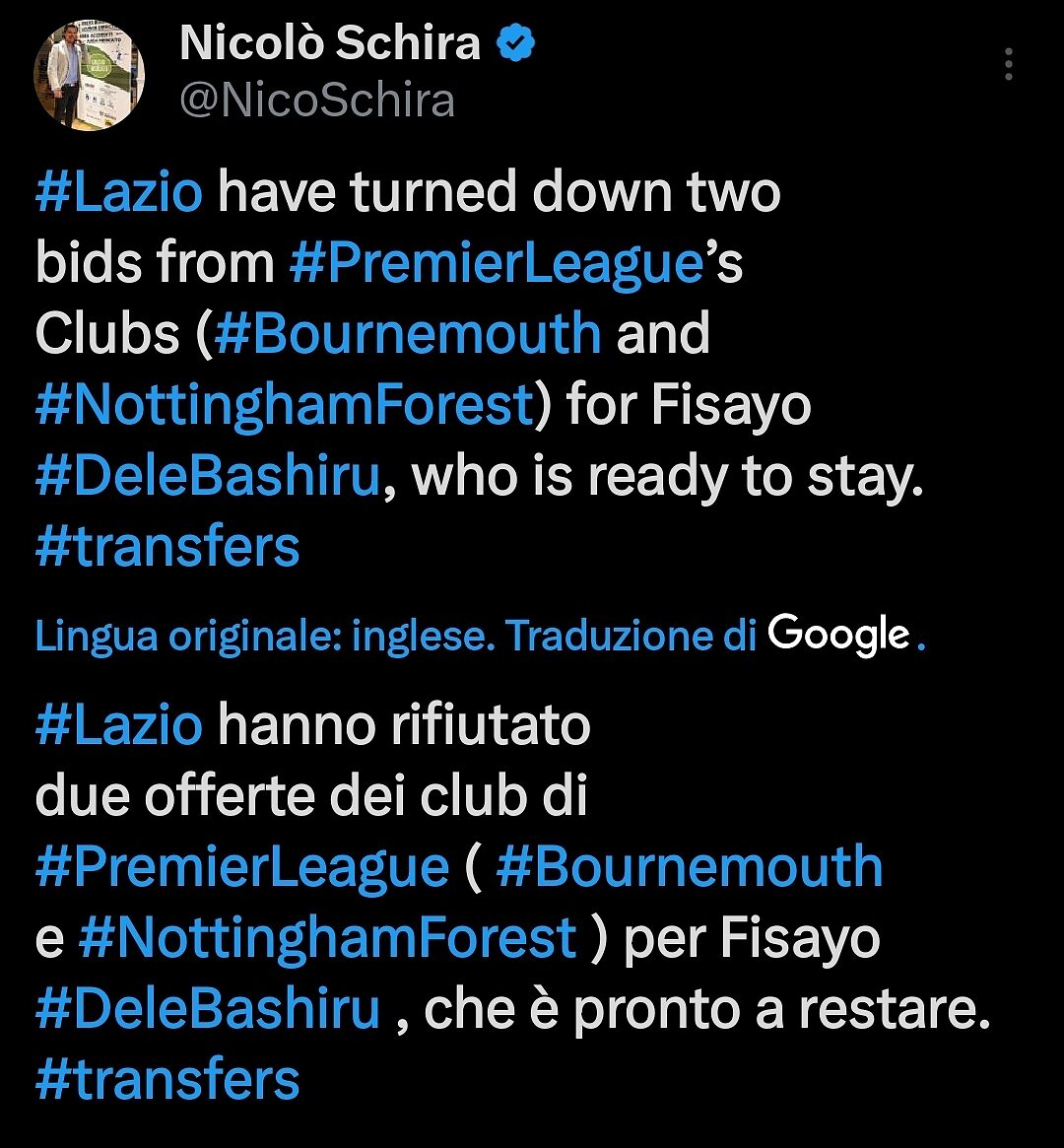 L'esperto Nicolò Schira si è espresso sulla piattaforma social X riguardo due offerte fatte alla Lazio per Dele-Bashiru, rispettivamente una dal Bournemouth e l'altra dal Nottingham Forest.