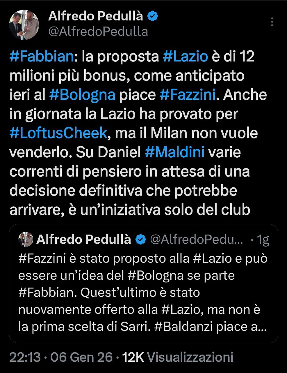 Alfredo Pedullà ha commentato sulla piattaforma social X la situazione inerente al mercato in entrata della Lazio, che sta puntando Fabbian, Loftus-Cheek e Maldini, calciatori rispettivamente del Bologna, Milan e Atalanta.