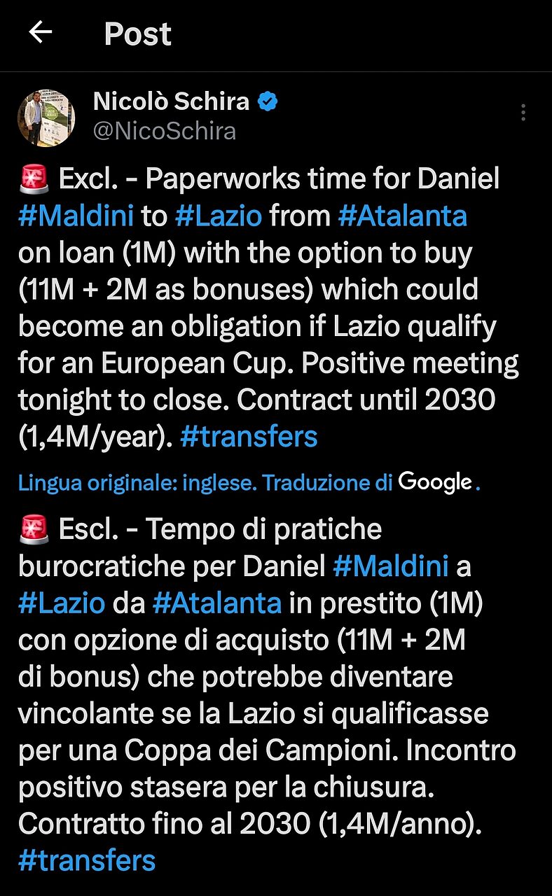 Il mercato di gennaio è ancora aperto e qualche nuovo acquisto può ancora arrivare, con la speranza di rinforzare la rosa biancoceleste, come ad esempio Daniel Maldini infatti, come riportato anche da Nicolò Schira sulla piattaforma social X, la Lazio e l'Atalanta stanno per giungere ad un accordo definitivo.