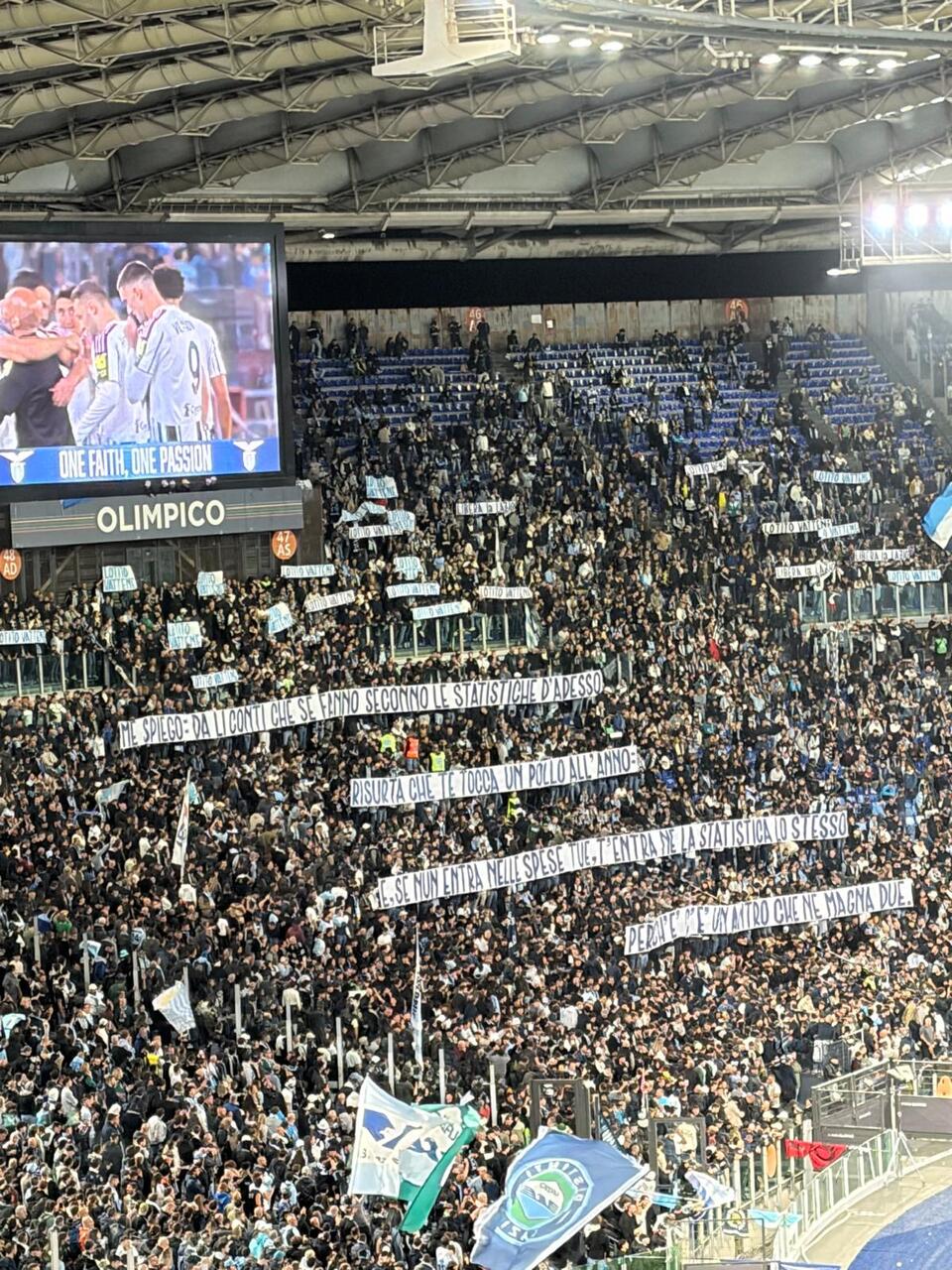 Poco prima del fischio d’inizio, la Curva Nord si è impegnata nel lanciare un messaggio alla società. In una partita così importante, i tifosi non fanno mancare il loro supporto alla squadra, senza mai rinunciare a dire la loro sugli spalti. I primi 15 minuti del match, non a caso, saranno segnati da una contestazione dei tifosi contro il presidente Lotito che, nel pre gara, ha rilasciato alcuni importanti dichiarazioni a Dazn. L’Olimpico rimarrà in silenzio per un quarto d‘ora, manifestando la propria posizione contraria all’attuale gestione societaria.