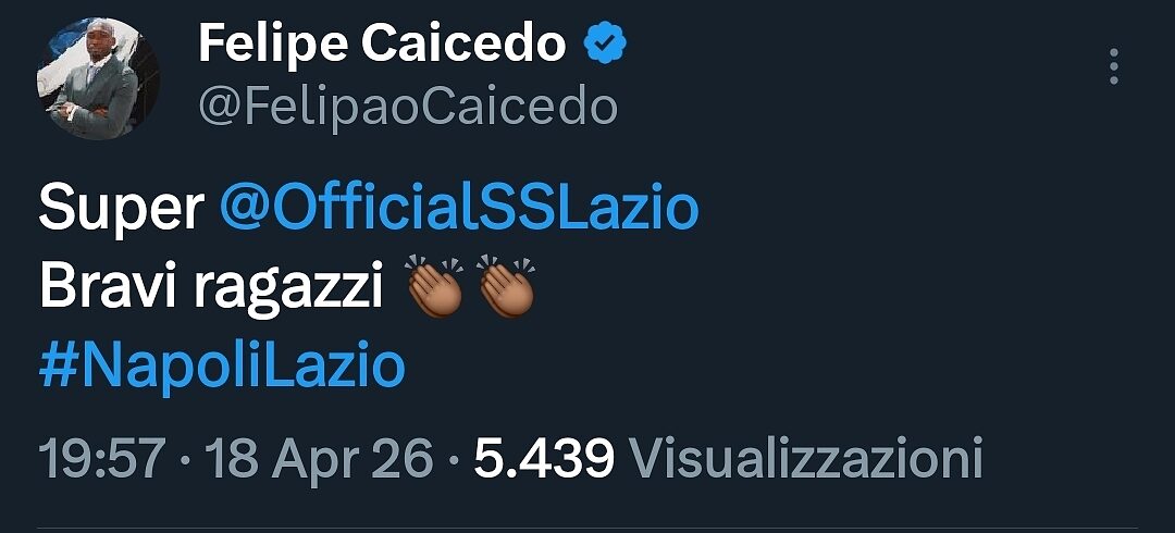La vittoria della Lazio al Maradona non è passata inosservata nemmeno agli occhi di chi, con la maglia biancoceleste, ha scritto pagine importanti della storia recente del club. Felipe Caicedo, storico ex attaccante laziale, ha voluto celebrare il successo della sua ex squadra con un entusiasta messaggio sui social. Un gesto che testimonia il legame ancora solido tra il giocatore e l'ambiente biancoceleste.