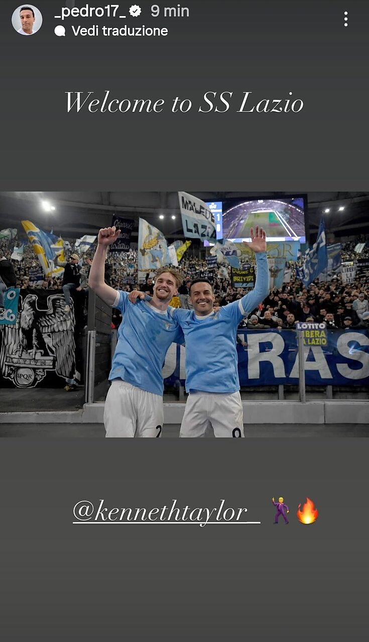 Una serata piena di emozioni allo stadio Olimpico, vittoria contro i rossoneri e cori provenienti dagli spalti, che hanno visto il momentaneo ritorno dei tifosi biancocelesti. Sui propri social, Pedro ha postato una storia insieme a Kenneth Taylor per dargli l'ufficiale benvenuto nella famiglia laziale.