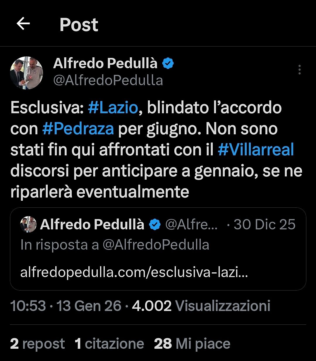 Alfredo Pedullà ha rivelato sulla piattaforma social X alcuni dettagli inerenti alla questione Lazio-Pedraza, calciatore del Villareal classe 1996, che è visto dal club biancoceleste come un ottimo sostituto per Nuno Tavares.