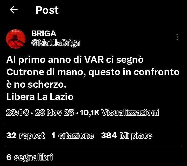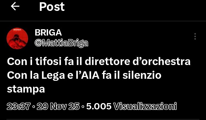 Al termine dell'incontro Milan-Lazio, terminata con la sconfitta della formazione biancoceleste e un rigore negato dal direttore di gara Collu, il cantante Briga si è sfogato sulla piattaforma X.