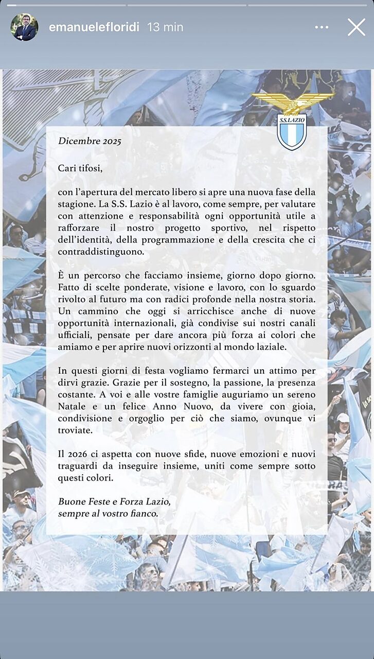 con l'apertura del mercato libero si apre una nuova fase della stagione. La S.S. Lazio è al lavoro, come sempre, per valutare con attenzione e responsabilità ogni opportunità utile a rafforzare il nostro progetto sportivo, nel rispetto dell'identità, della programmazione e della crescita che ci contraddistinguono.