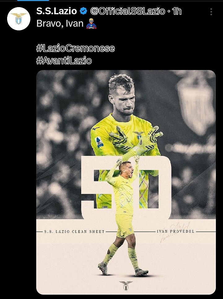 Nel corso della gara Lazio-Cremonese il portiere Ivan Provedel ha raggiunto un grande traguardo,  infatti, sono ufficialmente 50 i clean sheet da lui realizzati in maglia biancoceleste.